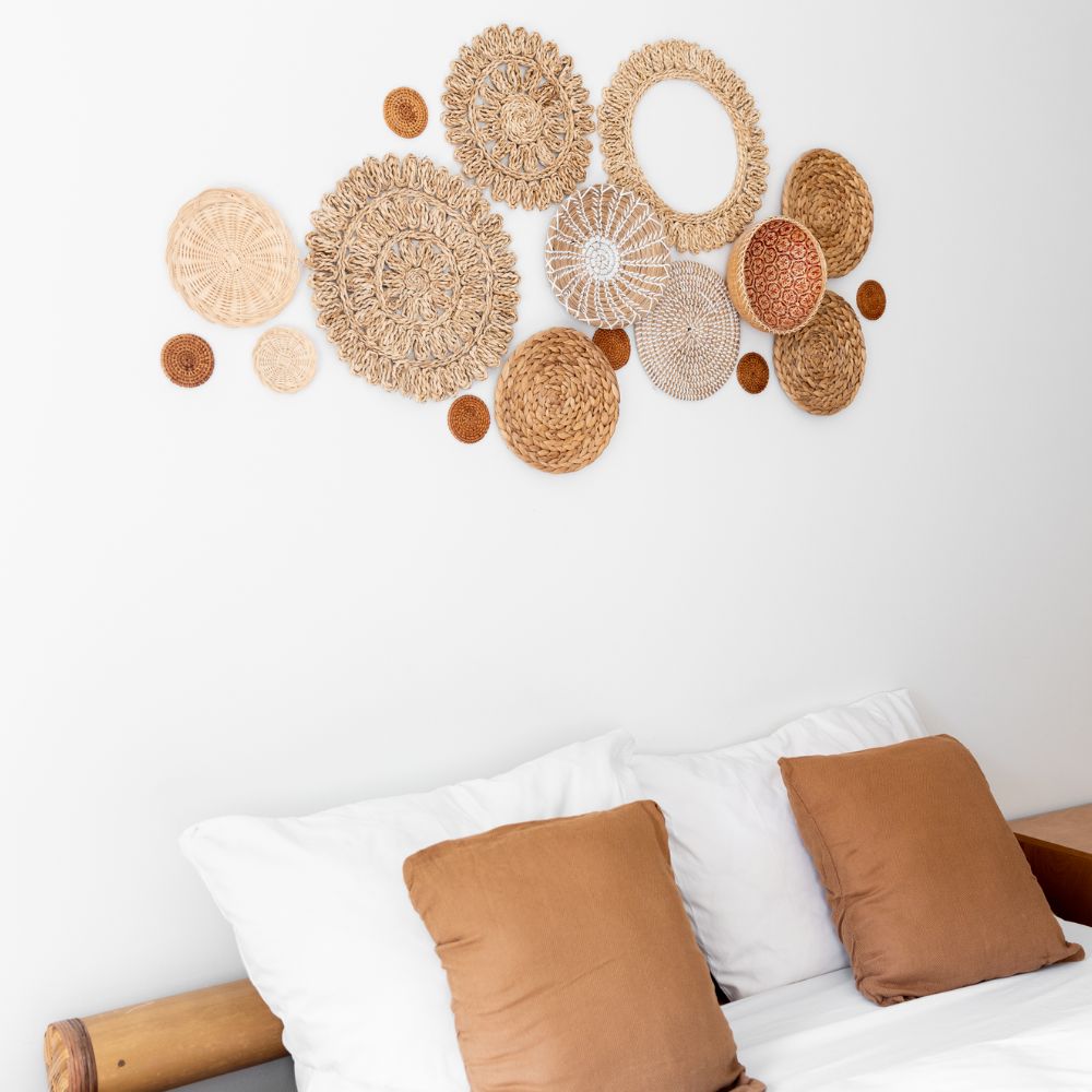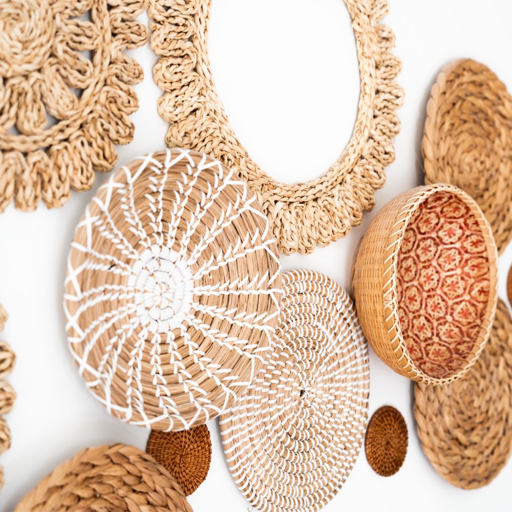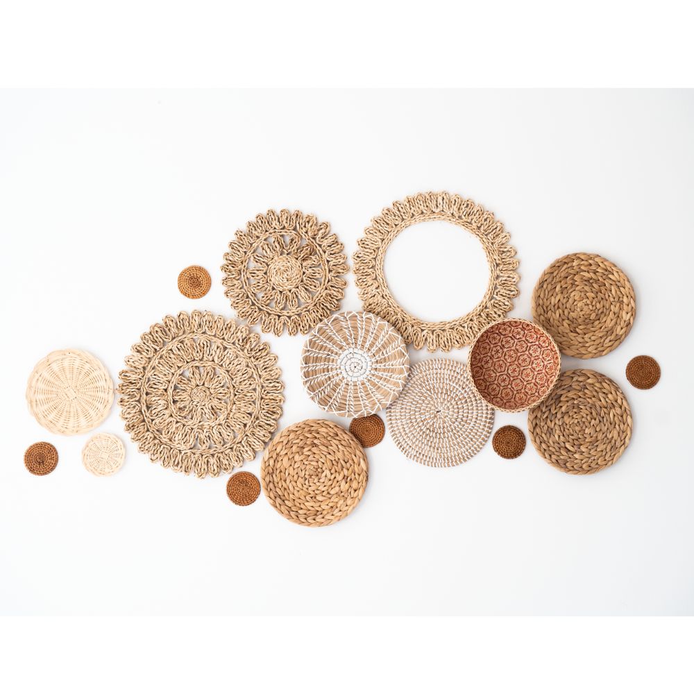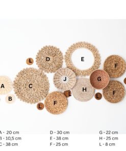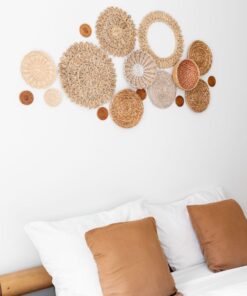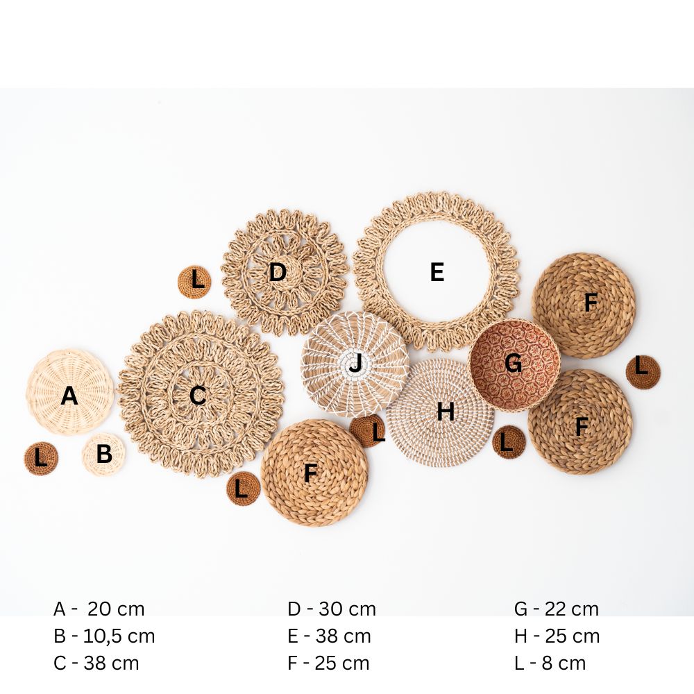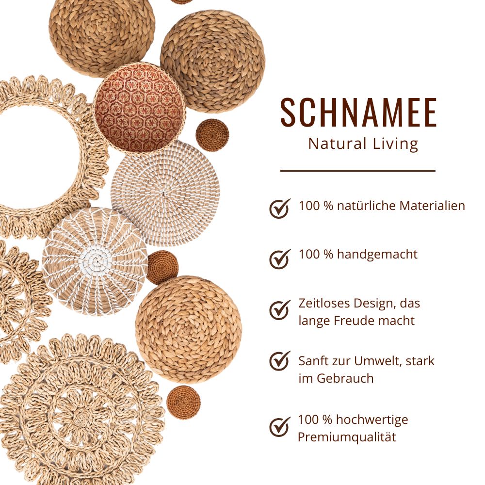 17 handgefertigte Wandkörbe aus Naturmaterialien. Größen: 8–38 cm. Ideal für Boho & Japandi-Stil